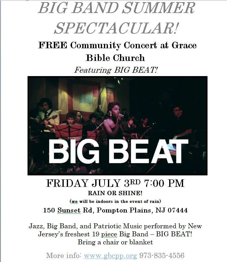 Allison McKenzie + Big Beat will be teaming for a special patriotic concert at Grace Bible Church to kick of the 4th of July weekend! The show goes from 7:00 - 9:00 PM and will feature spirituals, patriotic songs and Big Beat classics that are sure to get you on your feet! Don't forget to bring your sunblock, a beach chair and something to keep away bugs!
